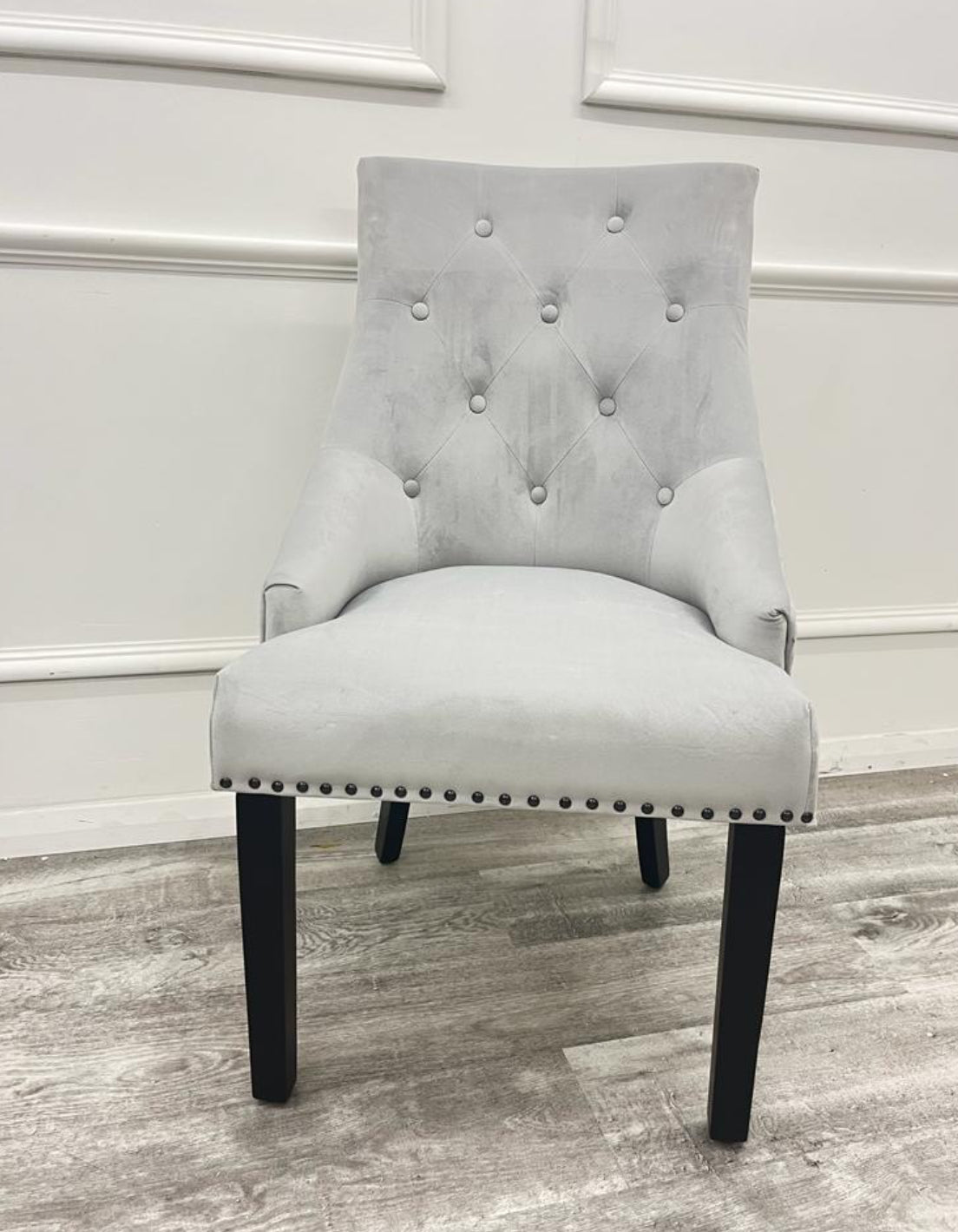 Our popular Bentley Chair is now available with Black Metal details. We've introduced this new option, which maintains the signature Bentley quilted back and adds a refreshing twist using black wood for the legs, studs and ring knocker. We have in Light Grey Velvet. Pair with our new black based Sintered stone tops, such as the Axel or Apollo Tables.