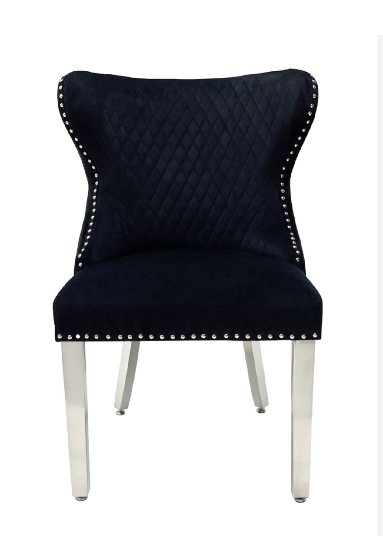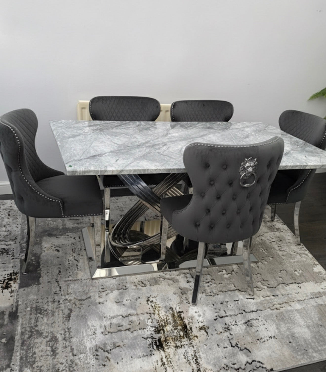 Rose 160cm Grey Marble Dining Table With Valentino Dark Grey Dining Chairs Lion Knocker