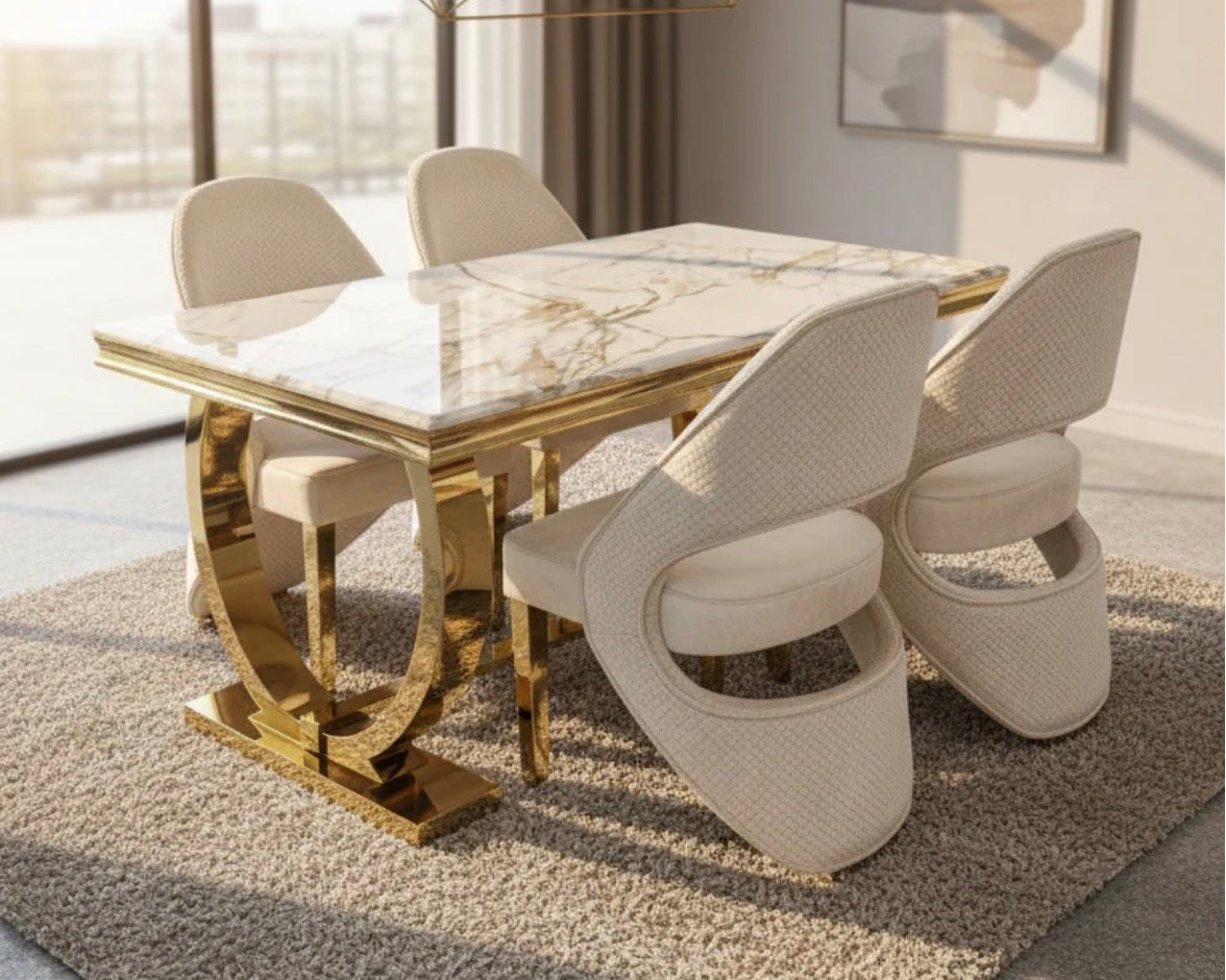 Arianna 160cm Gold Marble Dining Set With Santorini Cream And Gold Dining Chairs