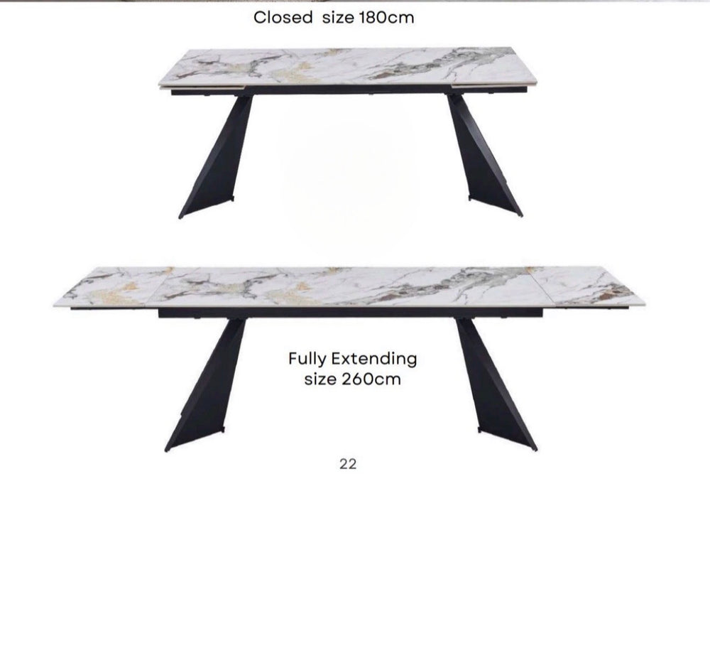Extendable Ceramic Dining Table 180–260cm – White Gold Top & Black Legs