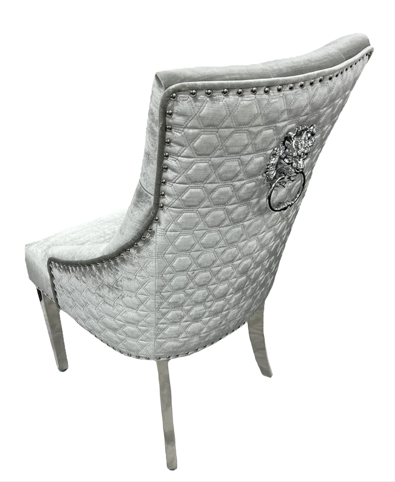 Each set pairs a solid marble table top with beautifully polished silver chrome legs, creating a striking contrast that blends effortlessly with contemporary and classic décors. Choose from plush velvet or sleek PU leather chairs – including eye-catching styles like lion knocker, ring knocker, or classic button-back designs – to match your personal style.