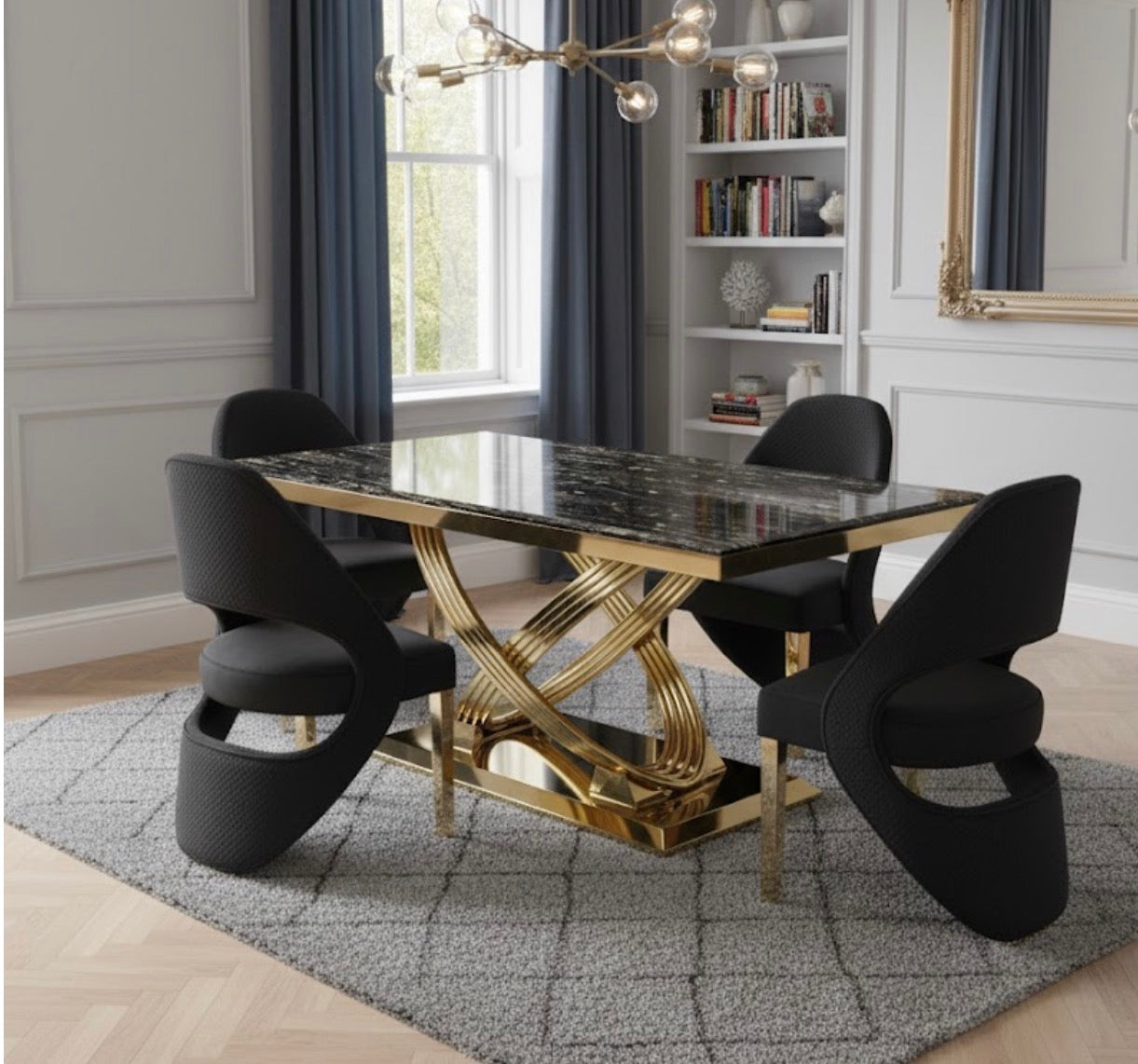 Luxury Black & Gold Dining Set – Modern Marble Top Table with Designer Chairs