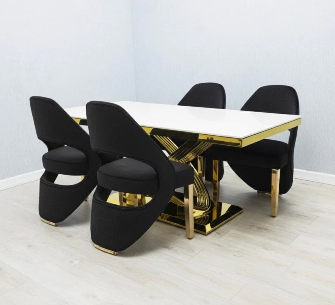 Rose Black and Gold Marble Dining Table + Santorini Black And Gold Dining Chairs